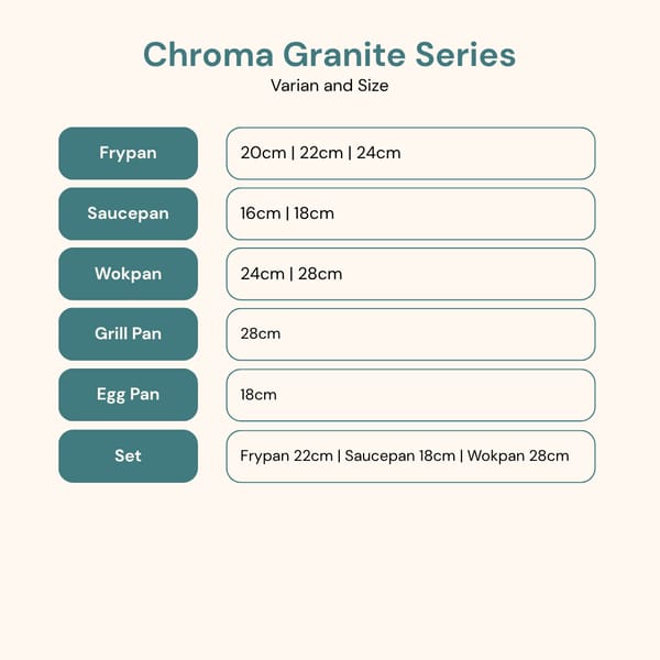 Roschel Chroma Granite Series adalah panci anti lengket dengan extra coating yang membuat lapisan panci lebih kuat dan awet. Ditambah dengan ketebalan extra 4mm, menjadikan Chroma Granite Series panci yang kokoh dan bisa diandalkan.