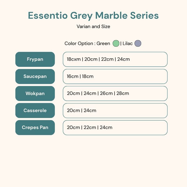Essentio Grey Marble Series menghadirkan warna yang cerah dan memberikan semangat di dapur Anda. Memiliki lapisan anti-lengket yang berkualitas dan bebas dari bahan kimia berbahaya. Dengan varian jenis dan ukuran yang lengkap, Essentio series cocok sebagai cookware untuk memulai perjalanan memasak semua kalangan.